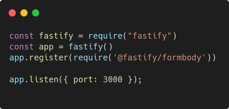 This code sets up a basic Fastify server that listens on port 3000. We also register the formbody plugin which allows us to parse form data from incoming requests.