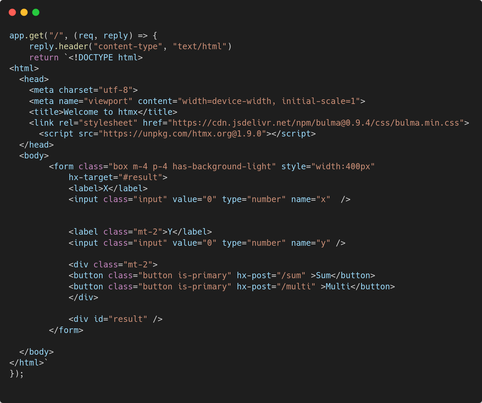 This code defines a route for the root URL (/) and returns an HTML form that contains two input fields for numbers x and y, and two buttons that perform addition and multiplication. We also include the htmx JavaScript library, which enables us to make dynamic HTTP requests to the server.