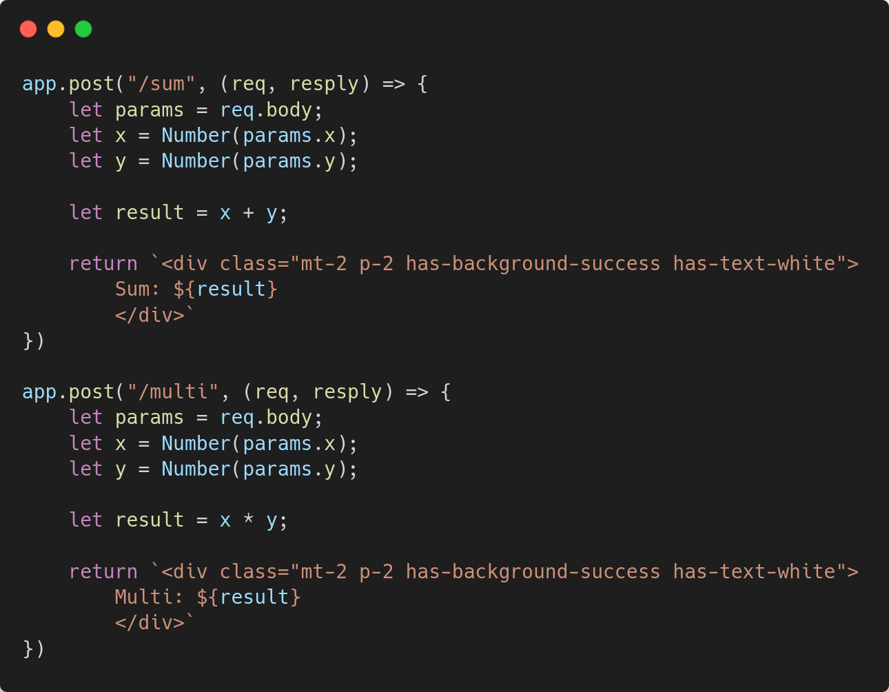 These two code blocks define two routes, /sum and /multi, which are triggered when the corresponding buttons are clicked. Each route extracts the values of x and y from the request body, performs the corresponding arithmetic operation, and returns the result as an HTML response.